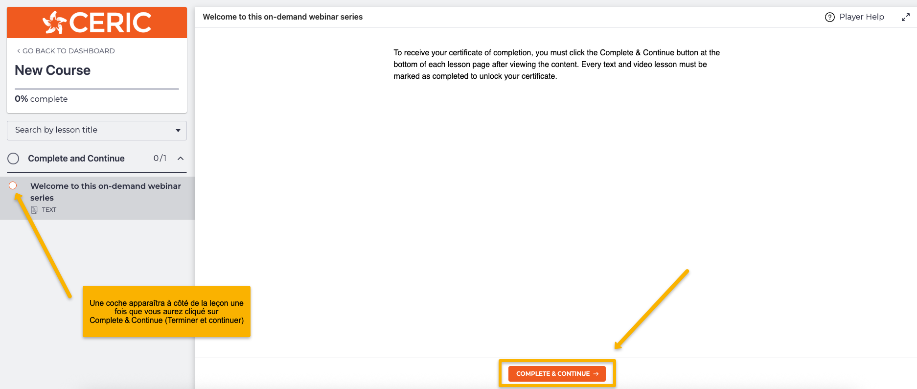Pour recevoir votre certificat d’achèvement, vous devez cliquer sur le bouton Complete & Continue (Terminer et continuer) au bas de chaque page de leçon après avoir visionné l’ensemble du contenu. Chaque leçon texte et vidéo doit être marquée comme Completed (Terminée) pour que vous puissiez débloquer votre certificat.