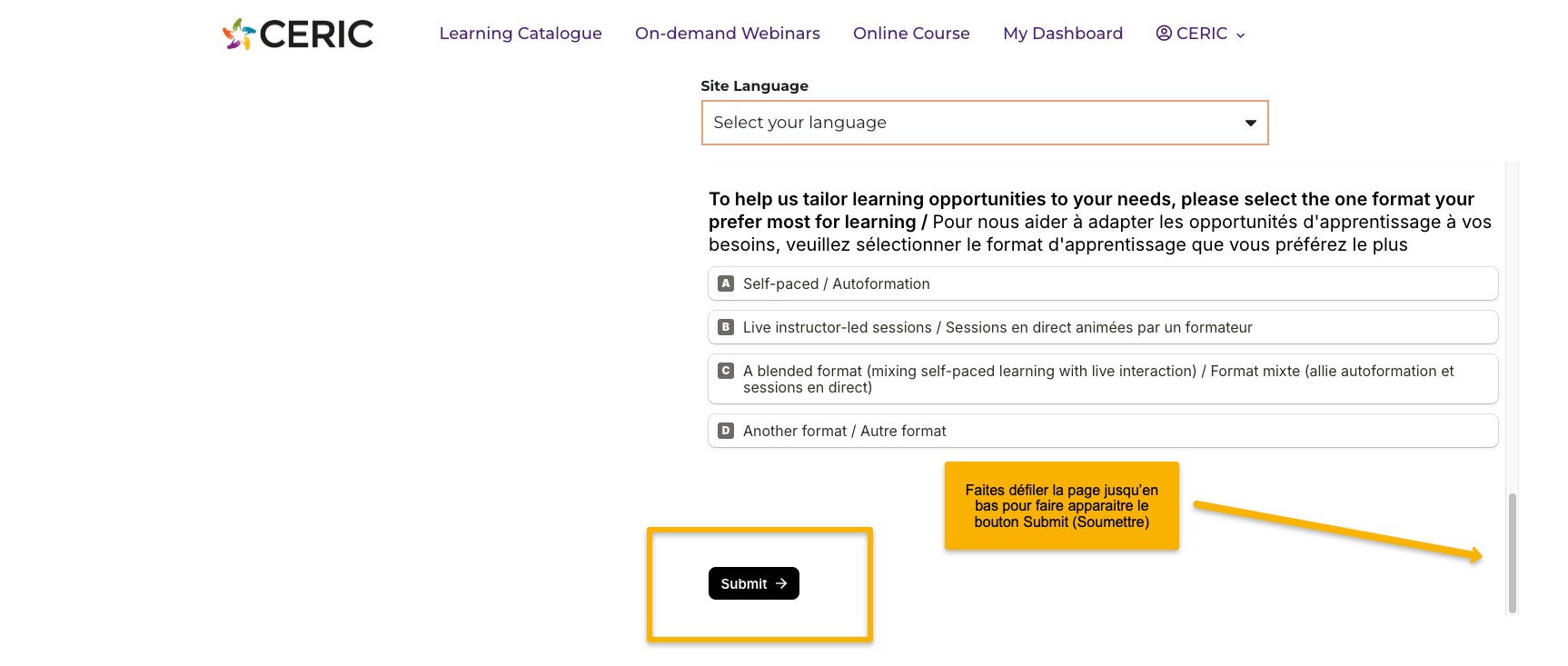 Actuellement, nos webinaires à la demande et nos cours sont disponibles en anglais, mais certains de nos webinaires à la demande sont sous-titrés en français. Consultez notre Catalogue de formation (Learning Catalogue) et utilisez les options de filtrage pour sélectionner le contenu en anglais sous-titré français. Demeurez à l’affût pour du contenu en français qui sera disponible bientôt! Vous pouvez également sélectionner le français comme langue pour l’interface du site; consultez la section « Comment puis-je changer mes préférences linguistiques? » ci-dessous pour les instructions.