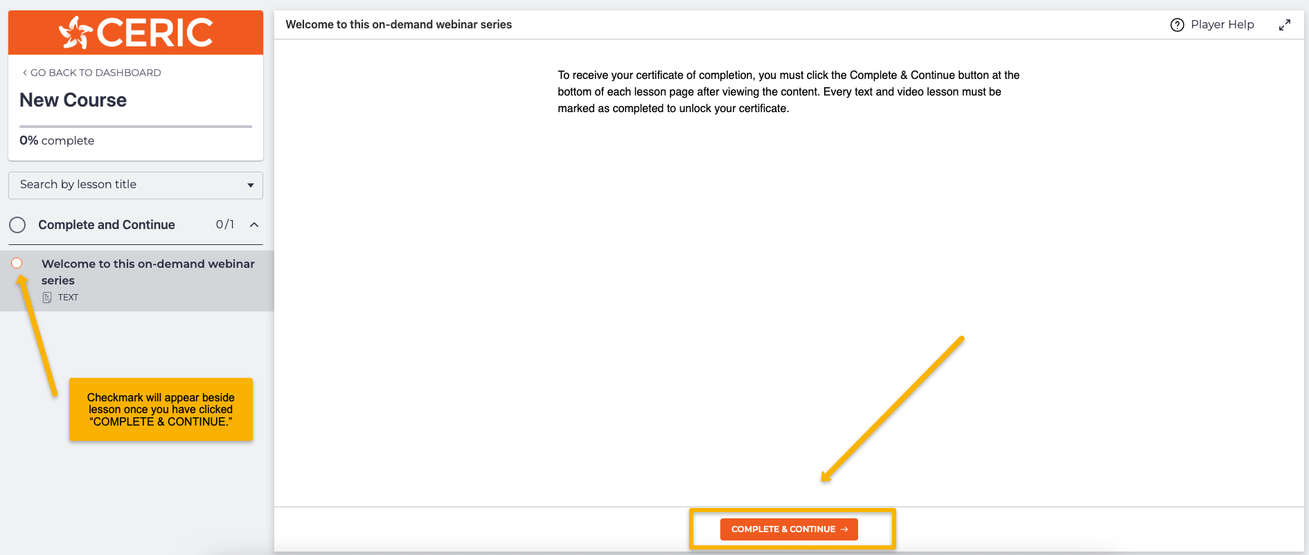 Every text and video lesson must be marked as completed to unlock your certificate. Please note: If you navigate to the next lesson through the left-hand navigation menu without clicking the Complete & Continue button on your current lesson, it will not be marked as completed.