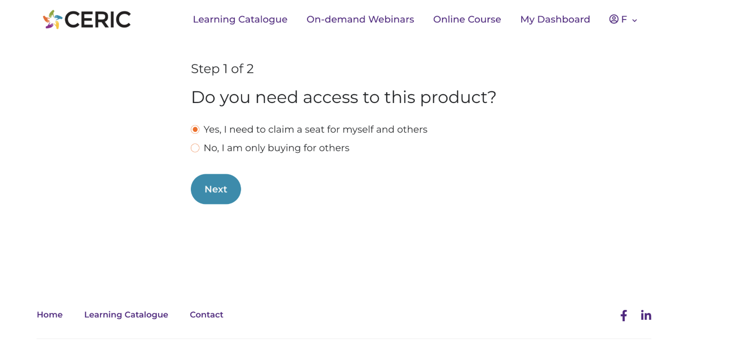 Once you process your payment, you will be prompted with the question, “Do you need access to this product?” and can select “Yes, I need to claim a seat for myself and others” or “No, I am only buying for others.”