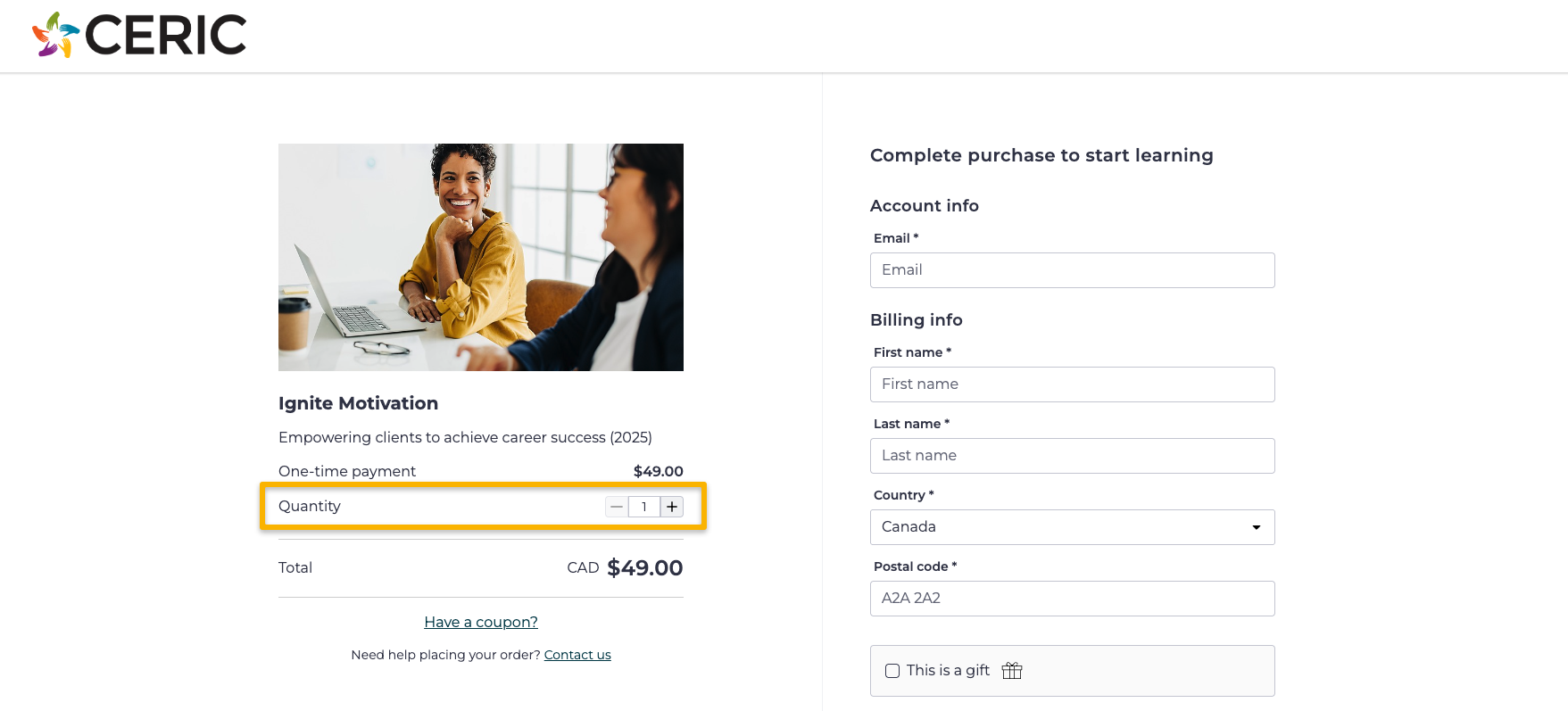 To purchase multiple registrations simultaneously for a single on-demand webinar series or course, increase the quantity on the registration page to align with your desired number of learners (e.g. if you are registering 5 people, change the quantity to 5). The price will update accordingly. Group purchasing is not available for free learning.