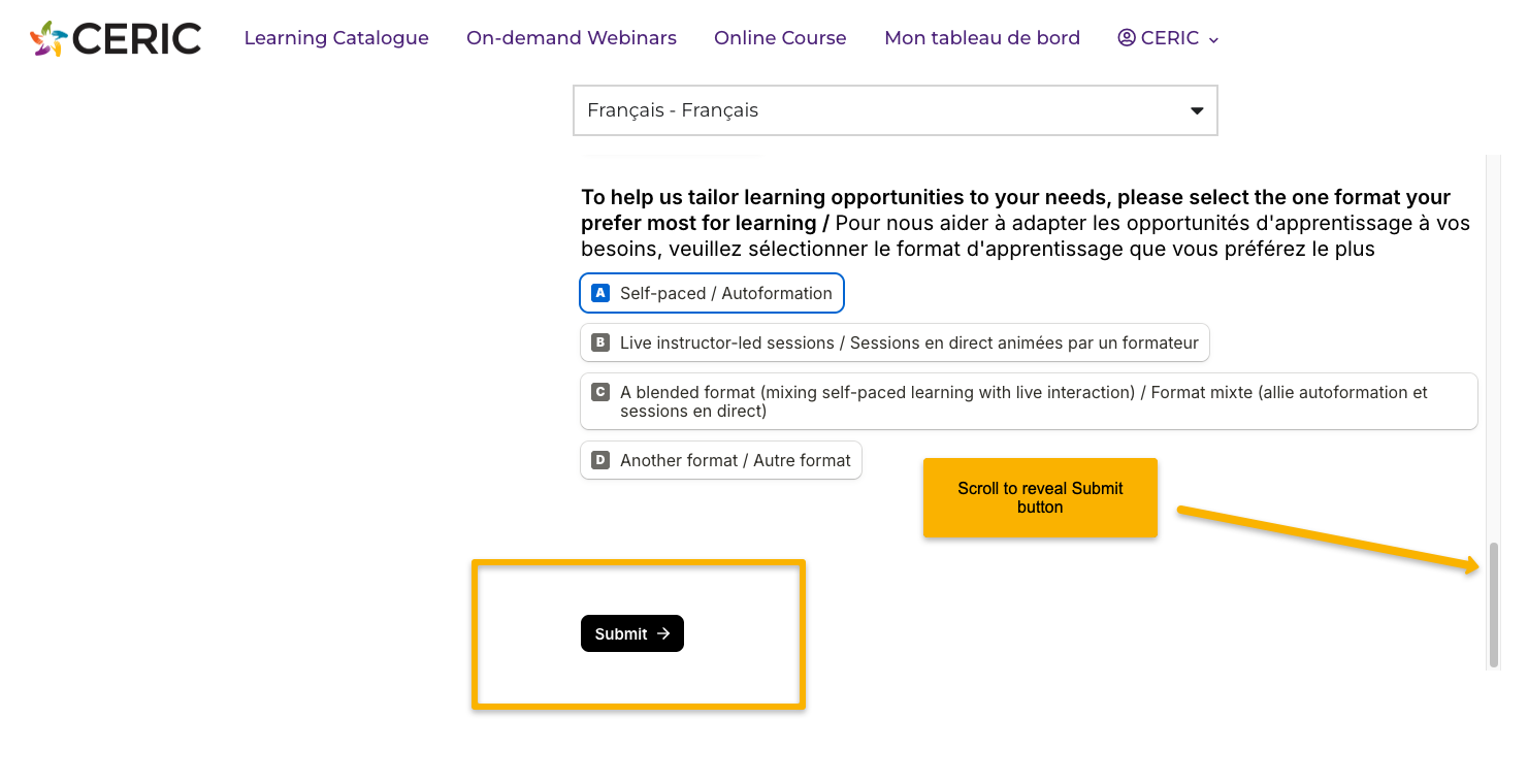 Currently, our on-demand webinars and course are available in English, though some of our on-demand webinars offer French subtitles. Visit our Learning Catalogue and use the filtering options to select learning in English or in English with French subtitles. Stay tuned for French learning – coming soon! You can also change your site interface to French; see the 'How to Change Your Language Preference' section below for instructions.
